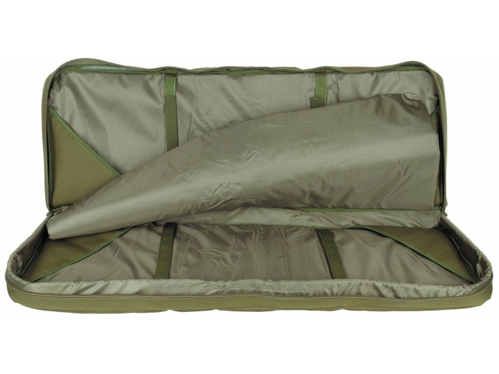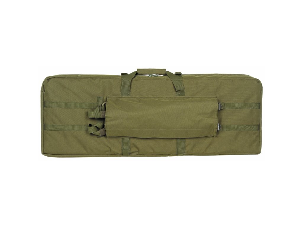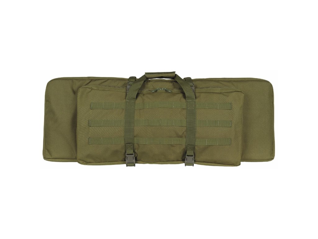 Weapons can be holsteredfix with 2 Velcro fasteners for each weapon individually. Weapons have between thempadded bulkhead. Fastening is by two-way zipper. The zipper can be conveniently locked. The case hasone external zipped pocket for carrying ammunition and shooting accessories.