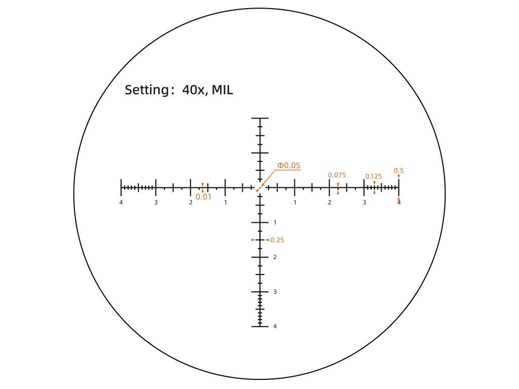 Puškohled využívá osnovu VCO-5 MIL ve druhé fokální rovině (SFP), díky čemuž zůstává záměrný obrazec konstantní při změně zvětšení. Jemný středový bod (0.01 MIL) umožňuje extrémně přesné zamíření bez zakrytí cíle.