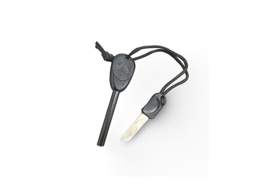 Škrtátko (striker) – většina levných křesadel má plechové škrtátko (~45 HRC). Naše je z nerezové oceli kalené na 56–58 HRC a má dvě ostré hrany.